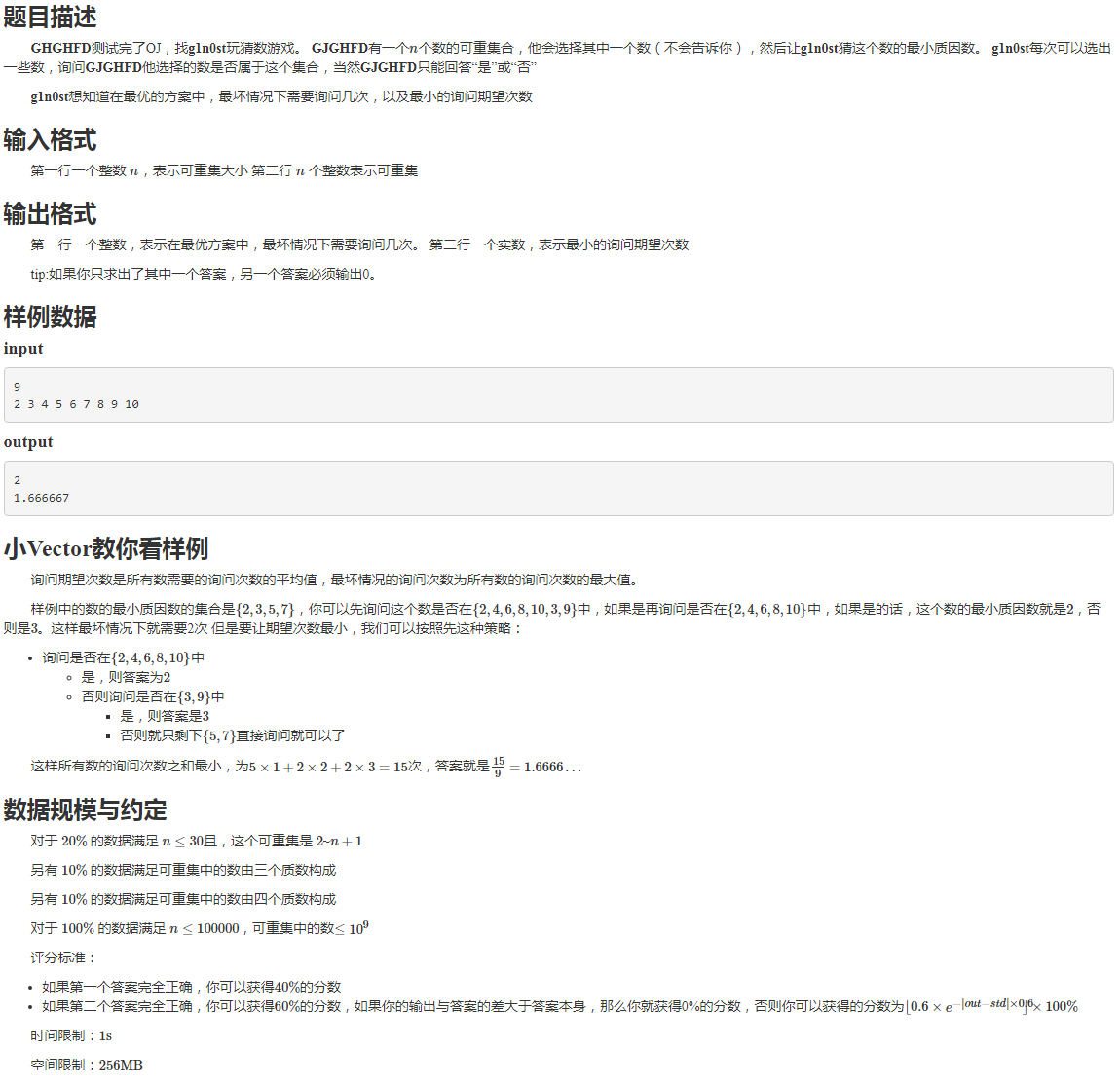 有一个 $n$ 个数的可重集合,小 A 会选择一个数,但不会告诉你这个数,让 B 猜它的最小质因数。B 每次可以选出一些数,问 A 他选择的数属不属于这个集合,A 只回答 “是” 或 “否”。
